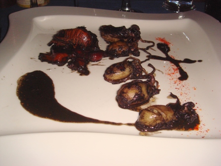 Yvan nous apporte alors une assiette où figurent des petites seiches cuites à l’encre, sur fond de Pata Negra et un cigalon baignant dans la même encre. Ce plat impose un rouge et c’est un Rimauresq, Côtes de Provence 1992 qui lui donne la réplique. L’accord est divin, car la sécheresse de l’encre fait ressortir le doucereux du vin. Le vin laisse son âpreté de côté, l’espace d’un instant, pour mettre en valeur ces chairs fondantes. Qu’y-a-t’il de plus beau que la chair d’un cigalon ? Il est difficile de répondre.