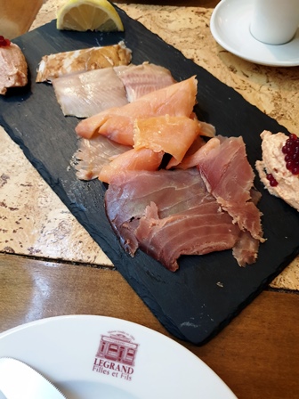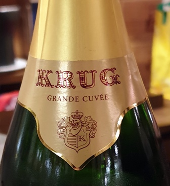 J’ai rendez-vous aux Caves Legrand avec Margareth Henriquez, présidente du champagne Krug, qui participera au prochain dîner de vignerons que j’organise chaque année. Ce sera le 19ème dîner. Nous avons des sujets à discuter à l’heure de l’apéritif. Margareth a un dîner mais nous allons déguster des planches garnies de tranches de poissons fumés en buvant un Champagne Krug Grande Cuvée 166ème édition. La base de ce champagne est 2010 mais il y a une douzaine de millésimes dans sa composition.