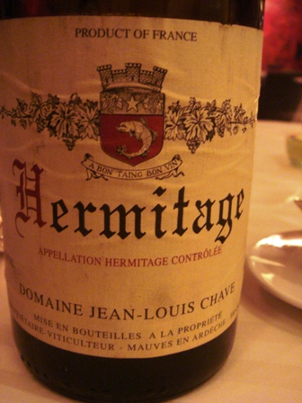 Nous discutons avec Eric Mancio du vin qui conviendrait à ce curieux assemblage de saveurs et je jette mon dévolu sur un Hermitage Chave blanc 1997.