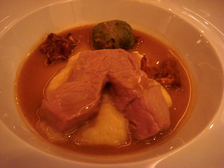 Malgré ma légitime appréhension, le vin arrive à mettre en valeur le petit pois, ce qui avouons-le, n’est pas évident. Il exhausse sa crudité alors qu’il se fait réservé sur l’œuf. L’Hermitage a des évocations de lait, de crème, de brioche et un fort poivre. J’avais hésité sur la carte entre le Chave et le Châteauneuf-du-Pape Vieux Télégraphe blanc 1992. Eric m’en apporte un verre. Immédiatement le Vieux Télégraphe apparaît plus ouvert, plus complexe, plus varié. Mais en y revenant on s’aperçoit que le Chave a plus de longueur et de race. Alors ? Comme souvent, il faut aimer les deux.