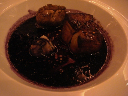 Je découpe la chair du quasi de veau sous les yeux de Guy qui me demande : « est-il trop ferme ? ». Je dis oui. « Est-il goûteux ? ». Je dis oui. Je fais remarquer à Guy Savoy que le chou farci qui est en garniture pourrait jouer un ton en dessous, car il monopolise le palais. Comme toujours, ce sont des remarques à la marge. Le Chateauneuf est plus rustique, le Chave est plus noble, le Chateauneuf est plus ensoleillé, le Chave est plus tendu. Le bouillon de veau est un bonheur gustatif. Le foie gras qui arrive est accompagné d’une sauce à la betterave, de copeaux de cèpes et de cèpes.
