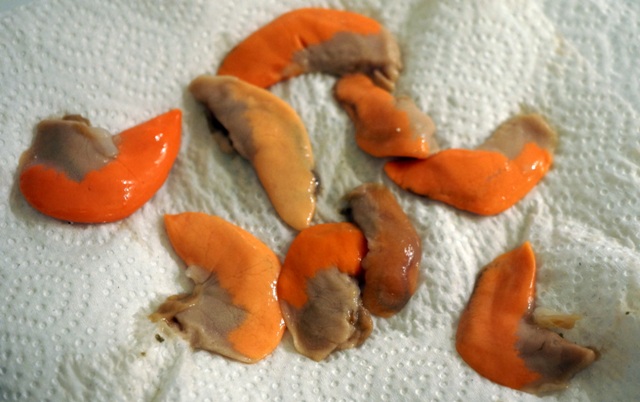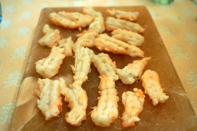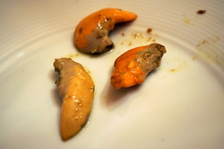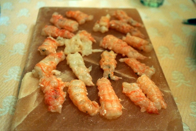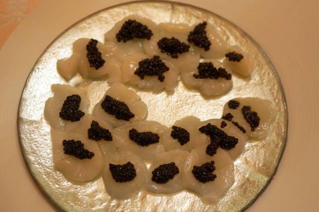 Nous n’allons pas gâcher notre repas. Un Champagne Dom Pérignon 2002 est immédiatement ouvert. La contreperformance du Krug est un tremplin pour le Dom Pérignon qui n’en paraît que plus spectaculaire. Il a tout, les fleurs blanches, les fruits blancs et une belle onctuosité. Il est vivant, rassurant, tout ce qu’il faut pour les coquilles et les deux caviars. L’Aquitaine est plus iodé, plus vif, plus claquant sur la langue. L’Uruguay est plus rond, plus gras, aux grains plus gros, et a plus d’ampleur en bouche. Il est moins long mais plus charmeur. Au final, malgré la pertinence de l’Aquitaine, c’est l’Uruguay qui emporte nos suffrages.