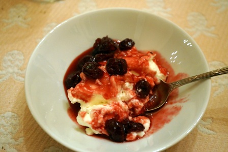 Mon fils est vraiment le chouchou de sa mère, car elle sort l’arme fatale contre l’anorexie, une crème fouettée que l’on inonde de griottes dans un coulis lourd comme le plomb.