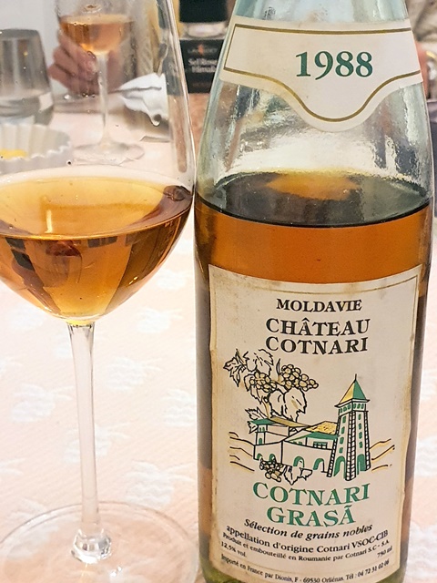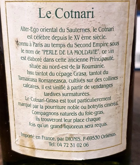 A la maison, ma femme a préparé des coquilles Saint-Jacques juste poêlées accompagnées d’épinards cuits dans du gras de foie gras. J’ai envie d’essayer ce soir un vin que j’ai acheté il y a une trentaine d’années et que je n’ai jamais goûté sauf au moment de l’achat. C’est un Château Cotnari Grasa sélection de grains nobles 1988. Ce vin roumain d’appelait au quinzième siècle « la perle de la Moldavie ». Il est vinifié comme le sauternes. Sa couleur est d’un bel or. Le nez évoque la couleur et en bouche il est agréable comme un sauternes. L’accord avec les coquilles est naturel et à ma grande surprise l’accord se trouve aussi avec les épinards délicieux, assouplis par leur cuisson.