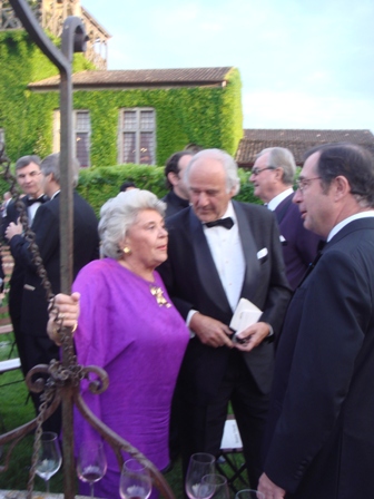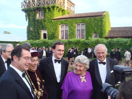 Lorsque l’on dépasse une certaine taille, les problèmes deviennent exponentiels. Les parkings sont très éloignés et c’est en petits trains comme ceux du jardin d’acclimatation du Bois de Boulogne que l’on rejoint le lieu de réception des invités. Malgré un petit balai passé sommairement sur les bancs en skaï, la poussière pénètre partout. Dans la cour d’entrée, des stands sont tenus par de ravissantes hôtesses habillées comme de carrés Hermès avec des couleurs vives toutes différentes, qui ne semblent pas apprécier qu’on les ait affublées d’espadrilles aux longs lacets. Sous une immense tente, les crus de Pessac-Léognan, beaucoup plus nombreux que lors de la soirée à Haut-Bailly où il n’y avait que les crus classés, sont offerts à cette belle assistance. Je goûte quelques vins déjà bus il y a cinq jours et Haut-Brion 2004 me semble refaire une partie significative de la différence que j’avais trouvée avec La Mission Haut-Brion 2004, alors à l’avantage de ce dernier. De délicieux canapés et petits toasts permettent de mieux déguster ces grands vins en dilettante, car l’important est de bavarder avec les personnes que l’on connaît : Sir Michael Broadbent et son épouse, mon idole dans le domaine des vins anciens, Andrée Médeville et son mari, Pierre Lurton et Carole, Olivier Bernard et Anne, Charles Chevallier et son épouse, Bernard Magrez que je vais saluer car je n’avais pu converser avec lui lors du dîner à Haut-Bailly alors que nous étions à la même table, Michel Bettane, très décontracté, Thomas Duroux de Palmer, et le Comte von Neipperg dont l’épouse ferait pâlir de jalousie toutes les impératrices Sissi, de très nombreux vignerons et des professionnels que je connais.