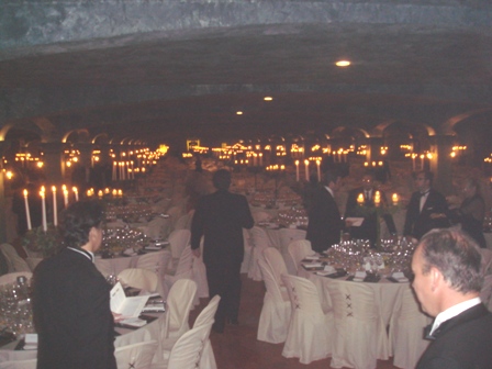 Les vins viendront aux tables en processions rythmées par un jeune tambour. Voici le menu : tartare de bar en surprise au caviar d’Aquitaine / jarret d’agneau « oublié au four » / l’ardoise du maître fromager / diagonale sucrée. Donner du poisson cru à une telle table et par une telle chaleur est un risque certain. Comme l’air circulait mal dans les chais, les bougeoirs brûlant tout l’oxygène, j’eus peur de ressentir les symptômes des mêmes maux que ma femme à El Bulli, mais les vins de Bordeaux font des miracles. Nous avons bien dîné.