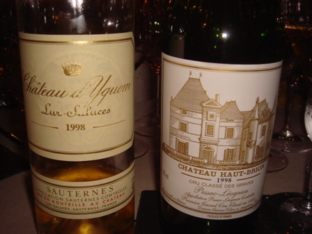 C’est en fait le Château Haut-Brion rouge 1998 qui marque mon retour à la vie, car je me dis, sans autre forme de procès : « ça c’est du vin ». Qu’on ne se méprenne pas, c’est l’observant qui n’est pas en forme, pas les observés, tous vins de qualité. Les fromages sont délicieux, les serveurs très attentifs, la vie est belle. Comme l’on finit le repas sur Yquem 1998 je vois à ma table mais fort loin car il est impossible de se parler une journaliste au visage fermé pendant le repas qui s’anime enfin comme une gamine qui aurait gagné le titre de Miss Léognan, car pour elle Yquem, c’est un vrai cadeau du ciel. Elle a cette réflexion que j’ai entendue souvent lorsque certaines personnes atteignent enfin de tels vins de légende : « c’est peut-être la seule fois de ma vie que j’en boirai ». J’espère qu’elle l’aura trouvé à son goût. Yquem sera toujours Yquem, il est toujours présent au rendez-vous, même dans une année qui n’est pas la plus célébrée.