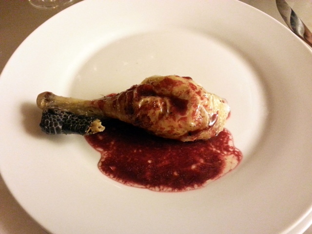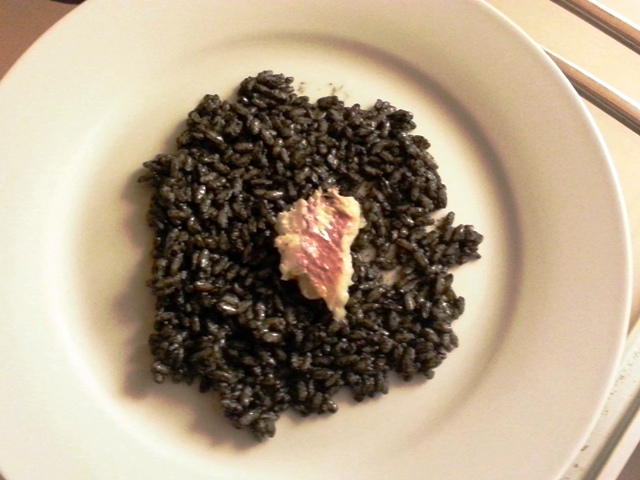 Jean-Philippe a fait un risotto à l’encre de seiche et au rouget, qui est fait avec le riz qu’utilise Davide Bisetto, le chef italien du Casadelmar en Corse. C’est une petite merveille sur le Meursault Charmes 1er Cru domaine des Comtes Lafon 2002. Le nez du vin pétrole, et en bouche, ce qui s’impose, c’est la caractère toasté du vin. Il est riche, opulent et n’a pas l’extrémisme que l’on trouve parfois de goût de caramel. Le vin est assez réduit, mais se comporte de très belle façon. Sa mâche est agréable, fruitée d’un citron bien dosé et la résonnance du riz est superbe.