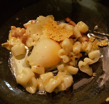 Nous sommes proches de la fin du champagne aussi pour le plat suivant de seiches et Vongole carbonara, Jean-Marc propose de nous offrir un vin blanc dont il nous dira plus tard qu’il est cher au cœur de Valérie et de lui-même, un Saint Aubin Les Murgers des Dents de Chien Françoise et Denis Clair 2009. Ce vin dans cette année est en effet le premier vin qui a été commandé par le premier client à l’ouverture du restaurant. Et la bouteille que nous allons boire est la dernière qui reste en cave de ce millésime. C’est un cadeau de haute valeur sentimentale. Le plat est délicieux. La mâche des fines tranches de seiche cuites comme des pâtes est superbe et les petites coques excitent bien le goût. Le vin est d’une adéquation parfaite au plat. Il est ample, large, gourmand et aussi profond. C’est sur les coques que je ressens la plus belle résonance. Merci Jean-Marc pour cette proposition et ce cadeau.