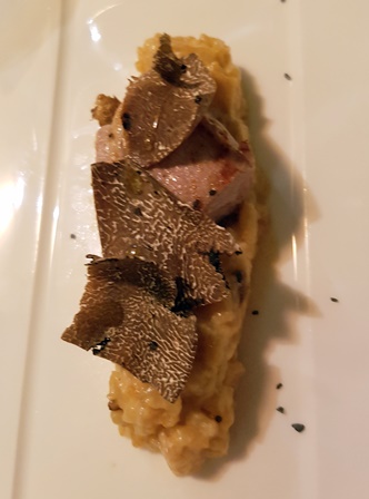 Le foie gras poêlé, mogettes et noisettes du Piémont est d’une qualité exceptionnelle. Il est d’une douceur rare. Il est d’une subtilité qui correspond à celle du Chambertin Grand Cru Jean & Jean-Louis Trapet 1999. Je suis définitivement amoureux de ce vin délicat, complexe et distillant ses charmes en strates raffinées. C’est un vin féminin, au velours exquis. Un bonheur et une longueur infinie.