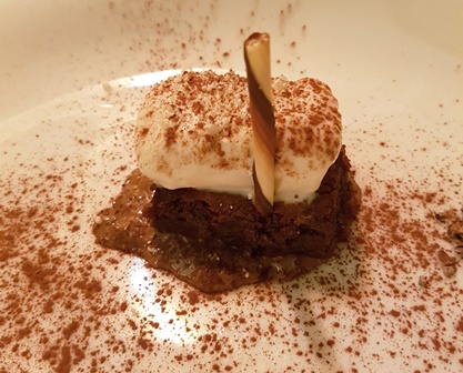 Je décide de faire l’impasse sur le dessert qui est un chocolat moelleux en feuillantine au poivre de Sichuan, mais Jean-Marc me harcèle gentiment en me disant que Valérie n’apprécierait pas que je quitte le lieu sans dessert aussi en impromptu réalise-t-elle une tombée de pêches de vigne au calisson. Je céderai des parts du calisson à mes voisins.