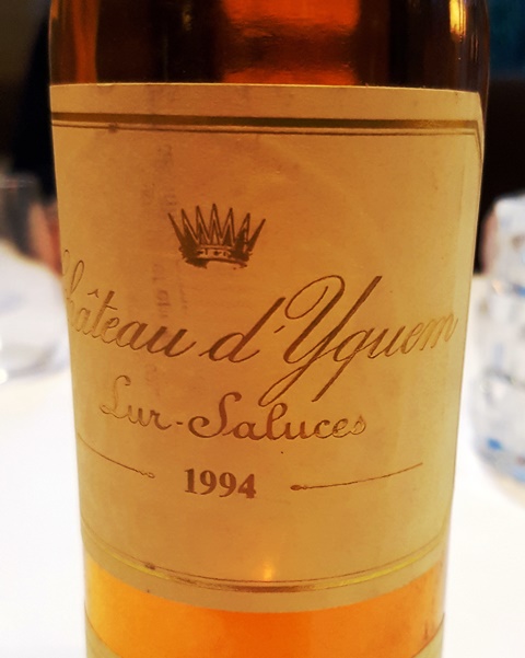 Depuis des années je conversais sur un forum puis par internet avec une femme professeur de lettres à Libourne et auteur d’un roman documenté sur le vin. Elle vient à Paris voir sa fille et me rend visite au restaurant Taillevent où se tiendra un dîner de vins anciens entre amis. Elle est accompagnée d’une pétulante femme de 86 printemps. J’ouvre pour elles une demi-bouteille de Château d’Yquem 1994. La couleur du vin est d’un or abricot. Le nez est plaisant, discret, très différent de la bouche qui a beaucoup plus de joie de vivre. Ce vin complexe lance des évocations dans des myriades de directions. Je vois des abricots mélangés à des abricots secs, des fruits exotiques frais ou confits, et des saveurs d’automne comme celles d’un mendiant avec des noix et noisettes. Le vin est glorieux et serein. C’est un bel Yquem qui est loin d’avoir atteint son apogée et vieillira bien. Pour la souriante octogénaire c’était son premier Yquem, ce qui ajoute au plaisir d’avoir partagé ce vin.